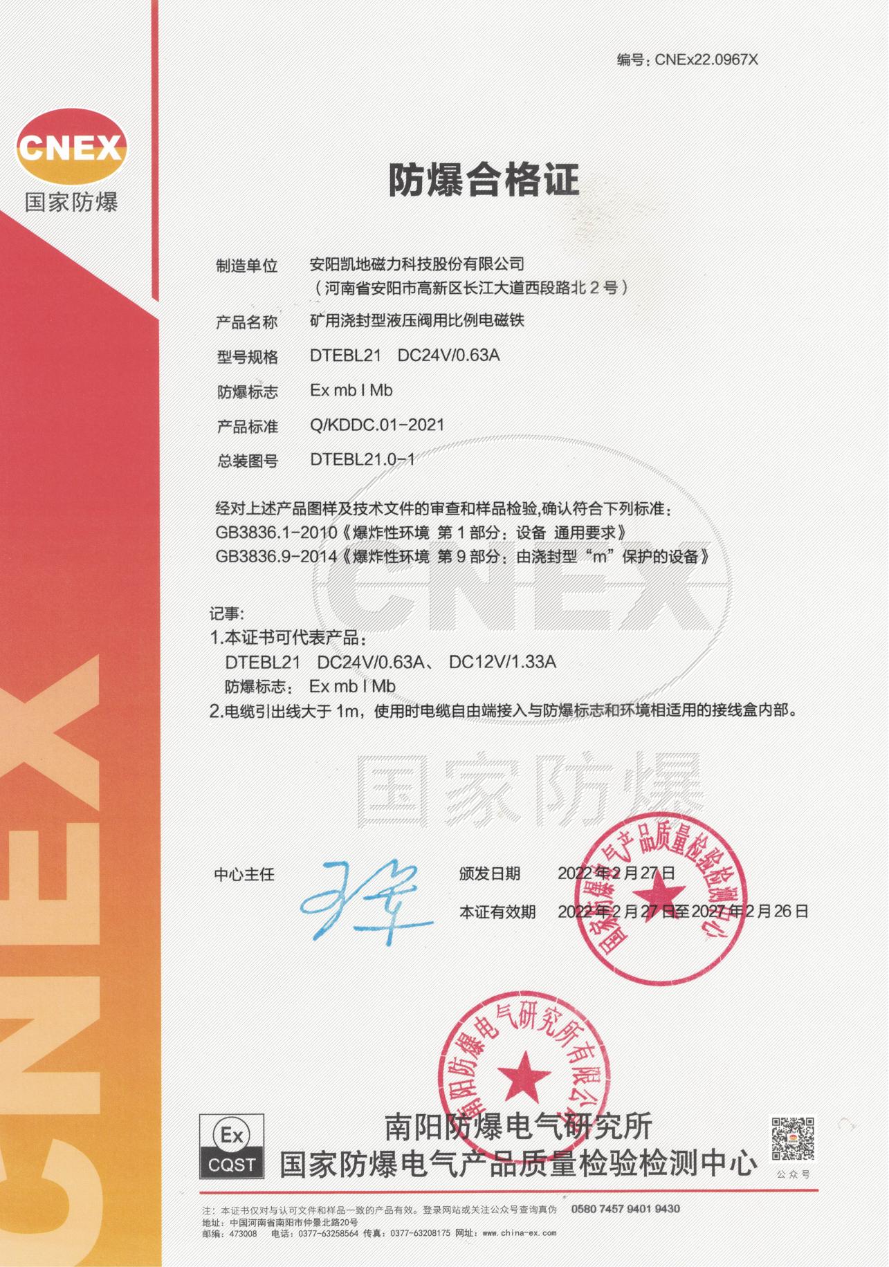 CNEx22.0967X DTEBL21 I類(lèi) 防爆合格證 有效期至2027年2月26日